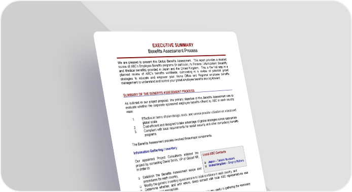EXECUTIVE SUMMARY Benefits Assessment Process We are pleased to present this Global Benefits Assessment. This report provides a detailed review of ABC’s Employee Benefits programs (in particular, its Pension, Life/Accident, Disability and Medical benefits) provided in Japan and the United Kingdom. This is the first step in a planned review of ABC’s benefits worldwide, culminating in a review of potential global strategies to educate and empower your Home Office and Regional employee benefits management to understand and control your global employee benefits moving forward. SUMMARY OF THE BENEFITS ASSESSMENT PROCESS As outlined in our project proposal, the primary objective of this Benefits Assessment was to evaluate whether the corporate sponsored employee benefits offered by ABC in each country were: 1. Effective in terms of plan design, costs, and service provider utilization on a local and global scale 2. Cost efficient and designed to take advantage of global strategies where appropriate 3. Compliant with local requirements for social security and other compulsory benefits programs. The Benefits Assessment process involved three major components: Information Gathering / Inventory Our appointed Project Consultants initiated the Local ABC Contacts project by contacting David Smith, VP of Global HR, in order to: ‰ Japan – Takashi Murakami ‰ United Kingdom – Gregory Mathers ‰ Establish the Benefits Assessment scope and procedures for each country, ‰ Modify the generic inventory questionnaire to local conditions in each country, and ‰ Determine whether, and with whom, direct contact with local ABC representatives was necessary and appropriate. In each case, the direct contact in each country proved very useful in gathering the necessary information and answering additional questions as they arose. The questionnaire results are provided in the “Summary of Existing Benefits” section of each Country Report to follow. Benchmark Analysis Based upon the information gathered during interviews with the ABC representatives, the local Project Consultants conducted a benchmark analysis of ABC’s programs that included: ‰ Comparison of the existing program with that offered by other companies of similar size, industry and location; and ‰ A review of the existing program with regard to local trends, customs and legislation. ABC – Global Benefits Assessment Page A - 1