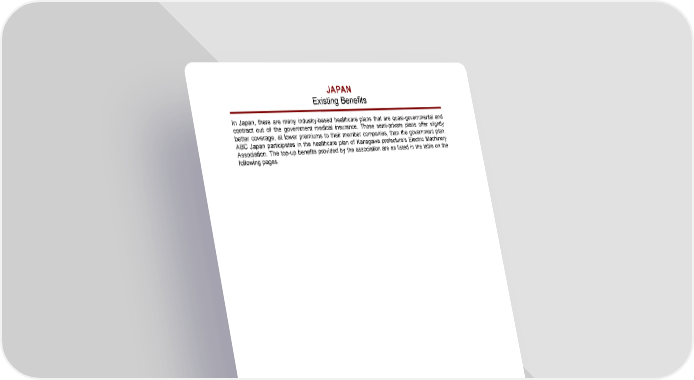 JAPAN Existing Benefits In Japan, there are many industry-based healthcare plans that are quasi-governmental and contract out of the government medical insurance. Those semi-private plans offer slightly better coverage, at lower premiums to their member companies, than the government plan. ABC Japan participates in the healthcare plan of Kanagawa prefecture’s Electric Machinery Association. The top-up benefits provided by the association are as listed in the table on the following pages. ABC Japan Co. Ltd. Page B - 3