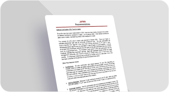 JAPAN Recommendations Defined Contribution (DC) Trend in Japan Since the new laws were implemented in 2001, there has been steady increase in the number of Defined Contribution pensions in Japan. As of January 2005, 1,260 Defined Contribution plans were in place, representing nearly 3,800 employers in Japan. The concept of a DC plan in Japan was enacted in October 2001. There are 2 types, a company-sponsored type and an individual contribution type. The plan participants can receive benefits from age 60 if they have been making contribution for 10 years or more. Withdrawals before age 60 are only permitted in case of death or severe disability. A choice of at least three investment vehicles must be given to the plan participants and one of these must be a guaranteed fund. The Employer must explain to the plan participants why the Employer selected the investment vehicles. Each plan participant directs his/her own asset management personally and must be allowed to change funds once or more every three months. An employee changing jobs is allowed to transfer funds to a new plan if he or she has been a member of the previous DC plan for at least three years. Other Plan features include: ‰ Contributions: DC plan contribution rate ranges between 7% and 10% depending on industry, which is usually set based on the existing DB plan benefits. However, the tax free contributions are capped at JPY 552,000 per annum, and a contribution over the cap is not permitted even on a taxable basis, and it accepts the employer contributions only. Since the cap is still low, many companies pay out the amount over the cap monthly as a top up on salary, or set up a book reserve plan that pays the amount equivalent to the loss as a lump sum when the employees leave the company. ‰ Vesting Schedule: Maximum 3 year vesting is allowed for the DC plan, which can either st nd rd be a cliff vesting (1 & 2 year are zero and 100% at the 3 year), or a gradual vesting. ‰ Employee Taxation: The DC contributions are not considered as employee’s income. The DC account is portable to a new employer DC plan and employees cannot take the money out until age 60. But when they withdraw their money after age 60, the lump sum is given a retirement income tax deduction and the pension a miscellaneous income tax deduction. The lump sum paid by the Book Reserve plan is also subject to a retirement income tax deduction while if the amount over the DC cap is paid as monthly / annual salary, it affects the employee’s income tax status and also increases the social security premiums for both the employer and employee. Life Insurance ABC may also wish to consider implementing a Group Life/AD&D scheme to remain competitive. Suggested parameters would be 2x annual base salary, capped at JPY 20-40 million for Life, with an additional 1 or 2 x annual base capped at JPY 10 million for AD&D. The estimated cost of adding this benefit would be about JPY 1.62 Million per year* given the current group size. *2 x annual base capped at 40 million for Life, and 2x annual salary capped at 10 million for AD&D rider. ABC Japan Co. Ltd. Page B - 14