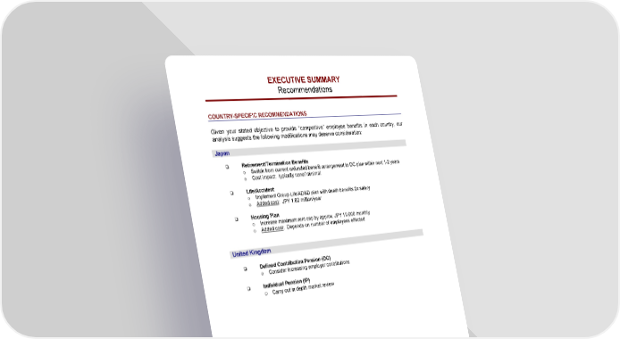 EXECUTIVE SUMMARY Recommendations COUNTRY-SPECIFIC RECOMMENDATIONS Given your stated objective to provide “competitive” employee benefits in each country, our analysis suggests the following modifications may deserve consideration: Japan ‰ Retirement/Termination Benefits o Switch from current unfunded benefit arrangement to DC plan within next 1-2 years o Cost impact: typically none/ minimal ‰ Life/Accident o Implement Group Life/AD&D plan with death benefits 2x salary o Added cost: JPY 1.62 million/year ‰ Housing Plan o Increase maximum rent cap by approx. JPY 10,000 monthly o Added cost: Depends on number of employees effected United Kingdom ‰ Defined Contribution Pension (DC) o Consider increasing employer contributions ‰ Individual Pension (IP) o Carry out in depth market review ABC – Global Benefits Assessment Page A - 4