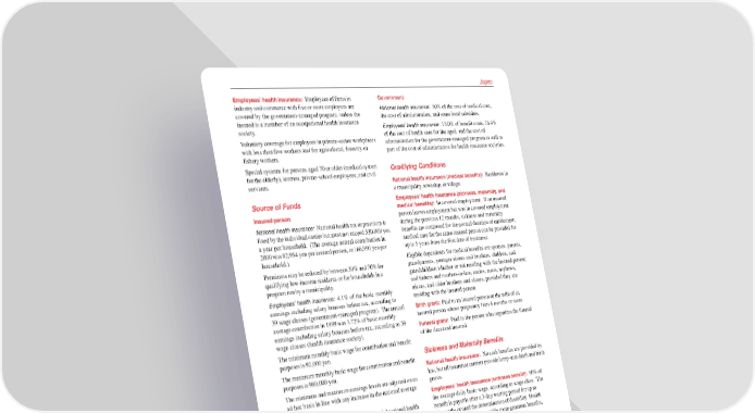 Japan Employees’ health insurance: Employees of firms in Government industry and commerce with five or more employees are National health insurance: 50% of the cost of medical care, covered by the government-managed program, unless the the cost of administration, and some local subsidies. insured is a member of an occupational health insurance Employees’ health insurance: 13.0% of benefit costs, 16.4% society. of the cost of health care for the aged, and the cost of Voluntary coverage for employees in private-sector workplaces administration for the government-managed program as well as with less than five workers and for agricultural, forestry, or part of the cost of administration for health insurance societies. fishery workers. Special systems for persons aged 70 or older (medical system Qualifying Conditions for the elderly), seamen, private-school employees, and civil servants. National health insurance (medical benefits): Residence in a municipality, township, or village. Source of Funds Employees’ health insurance (sickness, maternity, and Insured person medical benefits): In covered employment. If an insured person leaves employment but was in covered employment National health insurance: National health tax or premium is during the previous 12 months, sickness and maternity fixed by the individual carrier but must not exceed 530,000 yen benefits are continued for the normal duration of entitlement; a year per household. (The average annual contribution in medical care for the same insured person can be provided for 2000 was 82,954 yen per insured person, or 166,990 yen per up to 5 years from the first date of treatment. household.) Eligible dependents for medical benefits are spouses, parents, Premiums may be reduced by between 30% and 70% for grandparents, younger sisters and brothers, children, and qualifying low-income residents or for households in a grandchildren whether or not residing with the insured person; program run by a municipality. and fathers and mothers-in-law, uncles, aunts, nephews, Employees’ health insurance: 4.1% of the basic monthly nieces, and older brothers and sisters, provided they are earnings including salary bonuses before tax, according to residing with the insured person. 39 wage classes (government-managed program). The annual Birth grant: Paid to an insured person or the wife of an average contribution in 1999 was 3.72% of basic monthly insured person whose pregnancy lasts 4 months or more. earnings including salary bonuses before tax, according to 39 Funeral grant: Paid to the person who organizes the funeral wage classes (health insurance society). of the deceased insured. The minimum monthly basic wage for contribution and benefit purposes is 92,000 yen. Sickness and Maternity Benefits The maximum monthly basic wage for contribution and benefit National health insurance: No cash benefits are provided by purposes is 980,000 yen. law, but all insurance carriers provide lump-sum death and birth The minimum and maximum earnings levels are adjusted on an grants. ad hoc basis in line with any increase in the national average Employees’ health insurance (sickness benefit): 60% of wage. the average daily basic wage, according to wage class. The Self-employed person: Covered by special national health benefit is payable after a 3-day waiting period for up to insurance societies. 18 months or until the determination of disability. Health Employer insurance societies may provide more generous benefits. National health insurance: None. Maternity benefit: 60% of the average daily basic wage according to wage class is paid for 42 days before (98 days for Employees’ health insurance: 4.1% of the basic monthly expected multiple births) and 56 days after the expected date of payroll including bonuses before tax, according to 39 wage childbirth. The payment of benefit is discontinued or reduced classes (government-managed program). The annual average partially if the mother is receiving a wage or cash sickness contribution in 1999 was 4.786% of basic monthly payroll benefit. including bonuses before tax, according to 39 wage classes Birth grant: A lump sum of 300,000 yen. (health insurance society). Funeral grant: A lump sum of 100,000 yen is paid to a The minimum monthly basic wage for contribution and benefit deceased person’s dependent who organizes the funeral. If purposes is 92,000 yen. there is no dependent, the actual funeral expenses up to the The maximum monthly basic wage for contribution and benefit limit of the deceased’s basic wage for contribution purposes is purposes is 980,000 yen. paid to the person who organizes the funeral. The minimum and maximum earnings levels are adjusted on an ad hoc basis in line with any increase in the national average wage.