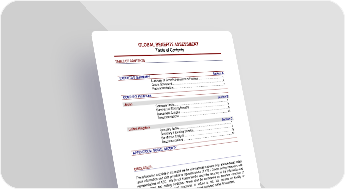 GLOBAL BENEFITS ASSESSMENT Table of Contents TABLE OF CONTENTS EXECUTIVE SUMMARY Section A Summary of Benefits Assessment Process.....................................1 Global Scorecard.............................................................................4 Recommendations...........................................................................5 COMPANY PROFILES Japan Section B Company Profile..............................................................................1 Summary of Existing Benefits..........................................................2 Benchmark Analysis........................................................................9 Recommendations ........................................................................13 United Kingdom Section C Company Profile..............................................................................1 Summary of Existing Benefits..........................................................2 Benchmark Analysis........................................................................5 Recommendations.........................................................................12 APPENDICES: SOCIAL SECURITY DISCLAIMER: The information and data in this report are for informational purposes only, and are based solely upon information and data provided to representatives of XYZ / Globex during interviews with representatives of ABC. We do not independently verify the accuracy of the information and data provided, and nothing contained herein shall be considered an accurate, complete or binding representation of actual exposures or values at risk. We assume no liability or responsibility for any errors, omissions or inadequacies contained in this Assessment. ABC – Global Benefits Assessment i