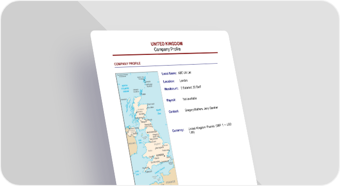 UNITED KINGDOM Company Profile COMPANY PROFILE Local Name: ABC UK Ltd Location: London Headcount: 2 Salaried, 20 Staff Payroll: Not available Contact: Gregory Mathers, Jerry Gardner Currency: United Kingdom Pounds (GBP 1 = USD 1.89) ABC UK Ltd Page C - 1