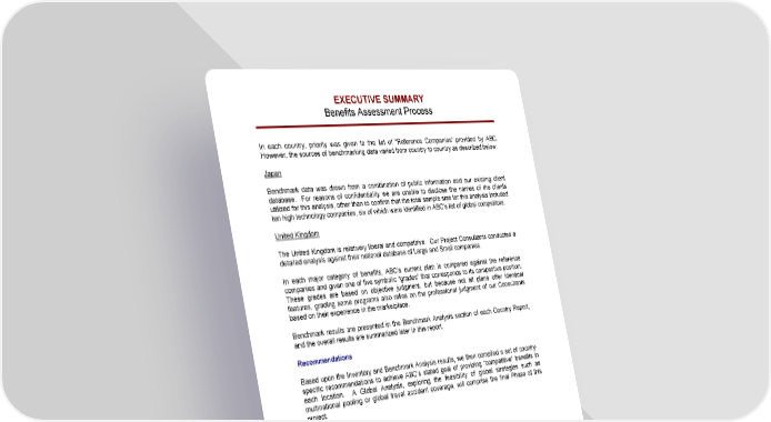 EXECUTIVE SUMMARY Benefits Assessment Process In each country, priority was given to the list of “Reference Companies” provided by ABC. However, the sources of benchmarking data varied from country to country as described below: Japan Benchmark data was drawn from a combination of public information and our existing client database. For reasons of confidentiality we are unable to disclose the names of the clients utilized for this analysis, other than to confirm that the total sample size for this analysis included ten high technology companies, six of which were identified in ABC’s list of global competitors. United Kingdom The United Kingdom is relatively liberal and competitive. Our Project Consultants conducted a detailed analysis against their national database of Large and Small companies. In each major category of benefits, ABC’s current plan is compared against the reference companies and given one of five symbolic “grades” that corresponds to its competitive position. These grades are based on objective judgment, but because not all plans offer identical features, grading some programs also relies on the professional judgment of our Consultants based on their experience in the marketplace. Benchmark results are presented in the Benchmark Analysis section of each Country Report, and the overall results are summarized later in this report. Recommendations Based upon the Inventory and Benchmark Analysis results, we then compiled a set of country- specific recommendations to achieve ABC’s stated goal of providing “competitive” benefits in each location. A Global Analysis, exploring the feasibility of global strategies such as multinational pooling or global travel accident coverage, will comprise the final Phase of this project. ABC – Global Benefits Assessment Page A - 2