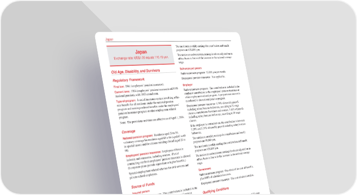 Japan The maximum monthly earnings for contribution and benefit Japan purposes are 620,000 yen. Exchange rate: US$1.00 equals 110.19 yen. The minimum and maximum earnings levels are adjusted on an ad hoc basis in line with the increase in the national average wage. Old Age, Disability, and Survivors Self-employed person National pension program: 13,300 yen per month. Regulatory Framework Employees’ pension insurance: Not applicable. First law: 1941 (employees’ pension insurance). Employer Current laws: 1954 (employees’ pension insurance) and 1959 National pension program: The contribution is included in the (national pension), with 1985 amendment. employer contribution to the employees’ pension insurance or Type of program: A social insurance system involving a flat- other employment-related program. A proportionate amount is rate benefit for all residents under the national pension transferred to the national pension program. program and earnings-related benefits under the employees’ Employees’ pension insurance: 6.79% of monthly payroll pension insurance program or other employment-related including salary bonuses before tax, according to 30 wage program. classes; contributions for miners and seamen, 7.48% of payroll Note: The provisions and rates are effective as of April 1, 2004. including salary bonuses before tax, according to 30 wage classes. Coverage If the employer is contracted-out, the contribution is between National pension program: Residents aged 20 to 59; 5.29% and 5.59% of monthly payroll including salary bonuses voluntary coverage for residents aged 60 to 64 (aged 65 to 69 before tax. in special cases) and for citizens residing abroad (aged 20 to The minimum monthly earnings for contribution and benefit 64). purposes are 98,000 yen. Employees’ pension insurance: Employees of firms in The maximum monthly earnings for contribution and benefit industry and commerce, including seamen. (Partial purposes are 620,000 yen. contracting-out from employees’ pension insurance is allowed The minimum and maximum earnings levels are adjusted on an if corporate plans provide equivalent or higher benefits.) ad hoc basis in line with the increase in the national average Special employment-related schemes for civil servants and wage. private-school employees. Government Source of Funds National pension program: One-third of the cost of benefits, plus 100% of administrative costs. Insured person Employees’ pension insurance: The cost of administration. National pension program: The contribution is included in the insured person’s contribution to the employees’ pension Qualifying Conditions insurance or other employment-related program. A proportionate amount is transferred to the national pension Old-age pension program. National pension program: Age 65 with a minimum of 25 years All other insured persons contribute 13,300 yen a month. of contributions (the coverage period can include years of Low-income spouses of workers insured under the coverage under any employment-related program belonging to employment-related program may apply for exemption from the insured’s dependent or common-law spouse). There is no payment. requirement to cease employment, and the pension is not Employees’ pension insurance: 6.79% of basic monthly earnings tested. earnings and salary bonuses before tax, according to 30 wage Early pension: An early pension is payable between ages 60 classes; miners and seamen contribute 7.48% of basic monthly and 64. There is no requirement to cease employment, and the earnings including salary bonuses before tax, according to pension is not earnings tested. 30 wage classes. Deferred pension: The pension may be deferred up to age 69. If the employer is contracted-out, the contribution is between Dependent supplement: No supplements are paid for a spouse 5.29% and 5.59% of monthly earnings including salary or children. (If the insured receives a supplement for a spouse bonuses before tax. under the employees’ pension insurance scheme, when the The minimum monthly earnings for contribution and benefit spouse reaches age 65 he or she will receive a pension under purposes are 98,000 yen. the national pension program equal to the employee’s pension