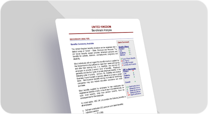 UNITED KINGDOM Benchmark Analysis BENCHMARK ANALYSIS Benefits Commonly Available Quick Scorecard The United Kingdom benefits structure can be separated into 3 Benefits Offered distinct areas or "pillars" – State, Employer and Personal. The Pension: Y √ UK Social Security system provides retirement pensions and Life: Y √ benefits for widows, sickness, unemployment, pregnancy and Disability: Y √ disability. Medical: Y √ Most individuals will not regard the benefit structure supplied by Y Typical Private Benefits the Government to be sufficient to meet their needs both during N Not Typical and after their working lives. It is, therefore, very common for √ Currently Provided employers to provide a second “pillar” of benefits. Employers X Currently Not Provided generally provide four types of private employee benefits, in the following order of priority: pension, life, disability and medical. ABC vs. Benchmarks Business Travel Accident is typically offered on a local or global Pension: ▼ Life: ▲ basis. Noninsurance benefits among multinational technology Disability: ‘ companies may also include education assistance and stock Medical: ▲ purchase. Overall: ▲ Most benefits supplied by employers to their employees are regarded as benefits in kind, in lieu of pay or as deferred pay. As ▲▲ Significantly Above such, most benefits, other than pension benefits, have tax ▲ Moderately Above consequences for the employee. ‘ Meets Benchmarks ▼ Moderately Below As noted earlier, ABC UK Ltd provides the following benefits to ▼▼ Significantly Below all employees: ‰ Defined contribution (DC) pension (with death benefits) ‰ Individual pension ‰ Life insurance (4 X DIS) ‰ Long term disability ‰ Medical plan (Up to family cover) ‰ Critical Illness / Personal Accident Insurance ‰ Holidays (over and above statutory) ABC UK provides statutory severance pay + 1 week / year based on basic salary (no fixed policy). They are covered by the UK social security retirement system. Overview of Benchmark Analysis In general, employee benefits provision in the United Kingdom varies primarily by level of employee and size of organization, and less so by industry and location. For this reason, our benchmark analysis has compared ABC UK with UK firms of similar size and employee classifications structure. ABC UK Ltd Page C - 5