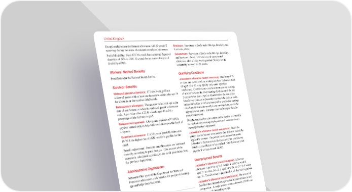 United Kingdom Exceptionally severe disablement allowance: £46.80 a week if Employer: See source of funds under Old Age, Disability, and receiving the top two rates of constant-attendance allowance. Survivors, above. Partial disability: From £23.36 a week for an assessed degree of Government: See source of funds under Old Age, Disability, disability of 20% to £105.12 a week for an assessed degree of and Survivors, above. The total cost of means-tested disability of 90%. allowances after a 3-day waiting period (30 days for the voluntarily insured) for 26 weeks. Workers’ Medical Benefits Provided under the National Health Service. Qualifying Conditions Jobseeker’s allowance (social insurance): Must be aged 18 Survivor Benefits or older and out of work or working less than 16 hours a week (if aged 16 or 17, may qualify only under specified Widowed parent’s allowance: £77.45 a week, paid to a conditions). Contributions must have been paid on earnings widowed parent with at least one dependent child under age 19 of at least 25 times the lower earnings level in one of the last for whom he or she receives child benefit. 2 complete tax years (April to March) before the start of the Bereavement allowance: The amount varies with age at the benefit year (January to December) in which the claim is made, date of entitlement or when the widowed parent’s allowance and contributions must have been paid or credited on earnings ends. Aged 55 or older, £77.45 a week; aged 45 to 54, a of at least 50 times the weekly lower earnings level in both the percentage of the full rate is paid. appropriate tax years. Earnings must not be higher than the Bereavement payment: A lump-sum payment of £2,000 is prescribed amount. payable immediately to help with costs arising on the death of Must be registered at a job center and be capable of, available a spouse. for, and actively seeking employment and must also have a Guardian’s allowance: £11.55 a week per child; reduced to current jobseeker’s agreement. £9.70 if the higher rate of child benefit is payable for the Jobseeker’s allowance (social assistance): Paid if the child. person has no income or an income that does not exceed the Benefit adjustment: Pensions and allowances are increased applicable amount. The person has no entitlement to the annually according to price changes. (The amount of the jobseeker’s allowance (social insurance); the contributory increase is calculated according to the retail price index from benefit is insufficient or has expired. The allowance is not the previous September.) payable if savings exceed £8,000. Administrative Organization Unemployment Benefits Jobcentre Plus (part of the Department for Work and Jobseeker’s allowance (social insurance): A flat-rate Pensions) administers cash benefits for people of working allowance is paid for up to 6 months at £54.65 a week if age and helps them find work. aged 25 or older, £43.25 if aged 18 to 24, or £32.90 if under age 18. The allowance is payable after a 3-day waiting period. Unemployment Jobseeker’s allowance (social assistance): The amount of the allowance depends on age and on household income and Regulatory Framework composition. A single person receives between £32.90 and £54.65 a week depending on age. First law: 1911. Current law: 1995 (jobseekers). Administrative Organization Type of program: Social insurance and social assistance Jobcentre Plus (part of the Department for Work and system. Pensions) administers cash benefits for people of working age and helps them find work. Coverage Family Allowances All unemployed jobseekers meeting the entitlement conditions. Regulatory Framework Source of Funds First law: 1945 (child benefit). Insured person: See source of funds under Old Age, Current laws: 1992 (consolidated legislation) and 2002 (tax Disability, and Survivors, above. credits). Type of program: Universal (child benefit) and tax credits system.