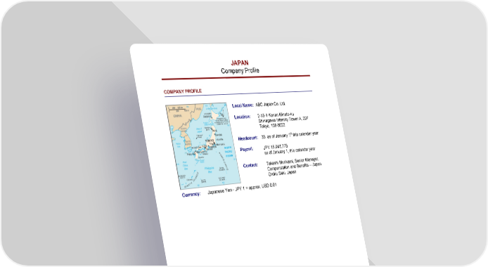 JAPAN Company Profile COMPANY PROFILE Local Name: ABC Japan Co. Ltd. Location: 2-15-1 Konan Minato-ku Shinagawa Intercity Tower A, 22F Tokyo, 108-6022 Headcount: 35 as of January 1st this calendar year Payroll: JPY 15,041,775 as of January 1, this calendar year Contact: Takashi Murikami, Senior Manager, Compensation and Benefits -- Japan Oroku Saki, Japan Currency: Japanese Yen - JPY 1 = approx. USD 0.01 ABC Japan Co. Ltd. Page B - 1