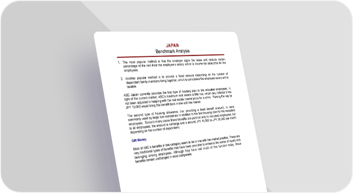JAPAN Benchmark Analysis 1. The most popular method is that the employer signs the lease and deducts certain percentage of the rent from the employee’s salary, which is income tax deductible for the employees. 2. Another popular method is to provide a fixed amount depending on the number of dependent family members living together, which is considered the employee salary and is taxable. ABC Japan currently provides the first type of housing plan to the relocated employees. In light of the current market, ABC’s maximum rent seems a little low, which may indicate it has not been adjusted in keeping with the real estate market price for a while. Raising the cap by JPY 10,000 would bring this benefit back in line with the market. The second type of housing allowance, (i.e. providing a fixed benefit amount), is more commonly used by large size companies in addition to the first housing plan for the relocated employees. Since in many cases these benefits are paid not only to relocated employees, but to all employees, the amount is not large and is around JPY 15,000 to JPY 30,000 per month depending on the number of dependants. Gift Money Most of ABC’s benefits in this category seem to be in line with the market practice. These are very traditional types of benefits that have been provided to enhance the sense of loyalty and belonging among employees. Although they have lost much of this function today, these benefits remain unchanged in most companies. ABC Japan Co. Ltd. Page B - 12