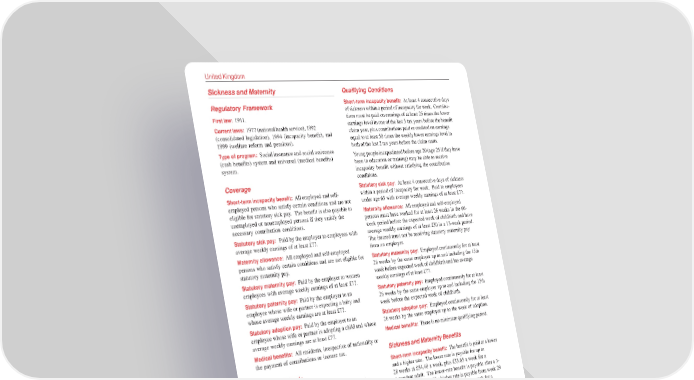 United Kingdom Sickness and Maternity Qualifying Conditions Regulatory Framework Short-term incapacity benefit: At least 4 consecutive days of sickness within a period of incapacity for work. Contribu- First law: 1911. tions must be paid on earnings of at least 25 times the lower Current laws: 1977 (national health service), 1992 earnings level in one of the last 3 tax years before the benefit (consolidated legislation), 1994 (incapacity benefit), and claim year, plus contributions paid or credited on earnings 1999 (welfare reform and pensions). equal to at least 50 times the weekly lower earnings level in Type of program: Social insurance and social assistance both of the last 2 tax years before the claim starts. (cash benefits) system and universal (medical benefits) Young people incapacitated before age 20 (age 25 if they have system. been in education or training) may be able to receive incapacity benefit without satisfying the contribution Coverage conditions. Statutory sick pay: At least 4 consecutive days of sickness Short-term incapacity benefit: All employed and self- within a period of incapacity for work. Paid to employees employed persons who satisfy certain conditions and are not under age 65 with average weekly earnings of at least £77. eligible for statutory sick pay. The benefit is also payable to Maternity allowance: All employed and self-employed unemployed or nonemployed persons if they satisfy the persons must have worked for at least 26 weeks in the 66- necessary contribution conditions. week period before the expected week of childbirth and have Statutory sick pay: Paid by the employer to employees with average weekly earnings of at least £30 in a 13-week period. average weekly earnings of at least £77. The insured must not be receiving statutory maternity pay Maternity allowance: All employed and self-employed from an employer. persons who satisfy certain conditions and are not eligible for Statutory maternity pay: Employed continuously for at least statutory maternity pay. 26 weeks by the same employer up to and including the 15th Statutory maternity pay: Paid by the employer to women week before expected week of childbirth and has average employees with average weekly earnings of at least £77. weekly earnings of at least £77. Statutory paternity pay: Paid by the employer to an Statutory paternity pay: Employed continuously for at least employee whose wife or partner is expecting a baby and 26 weeks by the same employer up to and including the 15th whose average weekly earnings are at least £77. week before the expected week of childbirth. Statutory adoption pay: Paid by the employer to an Statutory adoption pay: Employed continuously for at least employee whose wife or partner is adopting a child and whose 26 weeks by the same employer up to the week of adoption. average weekly earnings are at least £77. Medical benefits: There is no minimum qualifying period. Medical benefits: All residents, irrespective of nationality or the payment of contributions or income tax. Sickness and Maternity Benefits Source of Funds Short-term incapacity benefit: The benefit is paid at a lower and a higher rate. The lower rate is payable for up to Insured person: For incapacity benefit and maternity 28 weeks at £54.40 a week, plus £33.65 a week for a allowance, see source of funds under Old Age, Disability, and dependent adult. The lower-rate benefit is payable after a 3- Survivors, above. day waiting period. The higher rate is payable from week 29 Employer: For incapacity benefit and maternity allowance, to week 52 at £64.35 a week, plus £33.65 a week for a see source of funds under Old Age, Disability, and Survivors, dependent adult. above. The total cost of statutory sick pay (except for certain Statutory sick pay: £64.35 a week is payable for up to small employers) and 8% of statutory maternity and paternity 28 weeks of incapacity after a 3-day waiting period. pay. Maternity allowance: The allowance is paid for up to Government: 92% of statutory maternity and paternity pay 26 weeks. The 26 weeks may start at any time from the (100% in the case of some small employers) and a small 15th week before the expected date of childbirth to the week portion of statutory sick pay; most of the cost of medical following childbirth. The standard rate is £100; 90% of average benefits (National Health Service). The total cost of means- weekly earnings if earnings are less than £100. tested allowances. Statutory maternity pay: The benefit is payable for a total of Medical benefits are funded mainly from general taxation, 26 weeks. The first 6 weeks are paid at 90% of average with a small proportion from National Insurance earnings. The remaining 20 weeks are paid at £100 a week; contributions and patients’ copayments. 90% of average weekly earnings if earnings are less than £100.