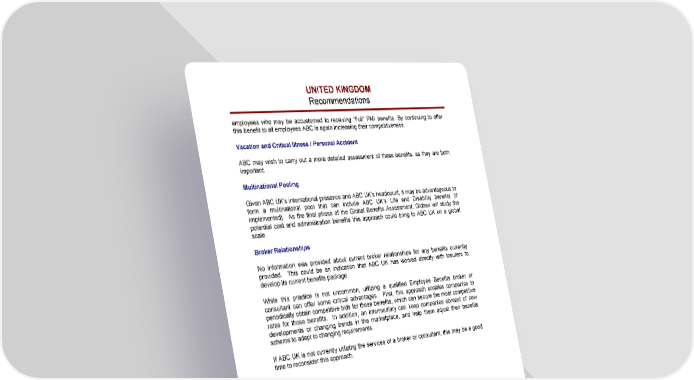 UNITED KINGDOM Recommendations employees who may be accustomed to receiving “Full” PMI benefits. By continuing to offer this benefit to all employees ABC is again increasing their competitiveness. Vacation and Critical Illness / Personal Accident ABC may wish to carry out a more detailed assessment of these benefits, as they are both important. Multinational Pooling Given ABC UK’s international presence and ABC UK’s headcount, it may be advantageous to form a multinational pool that can include ABC UK’s Life and Disability benefits (if implemented). As the final phase of the Global Benefits Assessment, Globex will study the potential cost and administration benefits this approach could bring to ABC UK on a global scale. Broker Relationships No information was provided about current broker relationships for any benefits currently provided. This could be an indication that ABC UK has worked directly with insurers to develop its current benefits package. While this practice is not uncommon, utilizing a qualified Employee Benefits broker or consultant can offer some critical advantages. First, this approach enables companies to periodically obtain competitive bids for those benefits, which can secure the most competitive rates for those benefits. In addition, an intermediary can keep companies abreast of new developments or changing trends in the marketplace, and help them adjust their benefits scheme to adapt to changing requirements. If ABC UK is not currently utilizing the services of a broker or consultant, this may be a good time to reconsider this approach. ABC UK Ltd Page C - 13