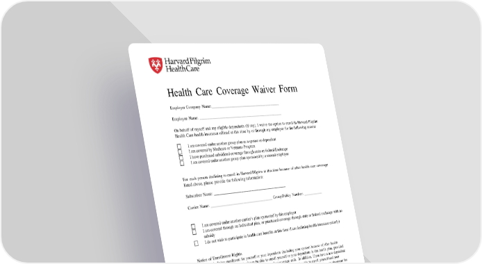 Health Care Coverage Waiver Form Employer Company Name:_______________________________________ Employee Name: _______________________________________________ On behalf of myself and my eligible dependents (if any), I waive the option to enroll in Harvard Pilgrim Health Care health insurance offered at this time by or through my employer for the following reason: I am covered under another group plan as a spouse or dependent I am covered by Medicare or Veterans Program I have purchased subsidized coverage through state or federal Exchange I am covered under another group plan sponsored by a second employer For each person declining to enroll in Harvard Pilgrim at this time because of other health care coverage listed above, please provide the following information: Subscriber Name: _________________________________________ ___________________________________ Group/Policy Number: ___________ Carrier Name: I am covered under another carrier’s plan sponsored by this employer I am covered through an Individual plan, or purchased coverage through state or federal exchange with no subsidy I do not wish to participate in health care benefits at this time (I am declining health insurance entirely) No Enrollment Rights tice of If you are declining enrollment for yourself or your dependents (including your spouse) because of other health insurance coverage, you may in the future be able to enroll yourself or your dependents in this health plan, provided that you request enrollment within 30 days after your other coverage ends. In addition, if you have a new dependent as a result of marriage, birth, adoption, or placement for adoption, you may be able to enroll yourself and your dependents, provided that you request enrollment within 30 days after the marriage, birth, adoption, or placement for adoption. I understand that any person choosing to enroll later must meet Harvard Pilgrim’s requirements for eligibility and for late enrollees. _______________ Employee Signature: ______________________________ Date: I affirm that the assertions in this form are true and complete to the best of my knowledge, and I understand that Harvard Pilgrim has the right to terminate coverage, retroactive to the effective date of coverage, for any material misinformation (including omissions) contained in this form. Employer Signature: ______________________________ Date: _______________ Harvard Pilgrim Health Care includes Harvard Pilgrim Health Care, Harvard Pilgrim Health Care of New England and HPHC Insurance Company. cc2459 04-14