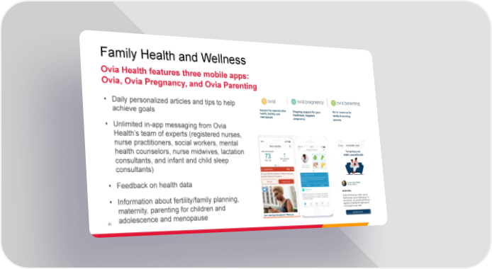 Family Health and Wellness Ovia Health features three mobile apps: Ovia, Ovia Pregnancy, and Ovia Parenting • Daily personalized articles and tips to help achieve goals • Unlimited in-app messaging from Ovia Health’s team of experts (registered nurses, nurse practitioners, social workers, mental health counselors, nurse midwives, lactation consultants, and infant and child sleep consultants) • Feedback on health data • Information about fertility/family planning, maternity, parenting for children and adolescence and menopause 45