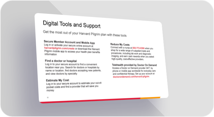 Digital Tools and Support Get the most out of your Harvard Pilgrim plan with these tools Secure Member Account and Mobile App Reduce My Costs Log in or activate your secure online account at Connect with a nurse at 855-772-8366 when you harvardpilgrim.com/create or download the Harvard shop for a wide range of outpatient tests and Pilgrim mobile app to access your health plan benefits procedures, including lab work and diagnostic information imaging, and earn cash rewards when you select Find a doctor or hospital high-quality, cost-effective providers. Log in to your secure account to find a convenient Telehealth provided by Doctor On Demand location near you. Search for doctors or hospitals by Access a Doctor on Demand provider 24/7, by name or location, find doctors accepting new patients, phone or mobile app worldwide for everyday care and view doctors by specialty and confidential therapy. Set up your account at Estimate My Cost doctorondemand.com/harvard-pilgrim. Log in to your secure account to estimate your out-of- pocket costs and find a provider that will save you money 35
