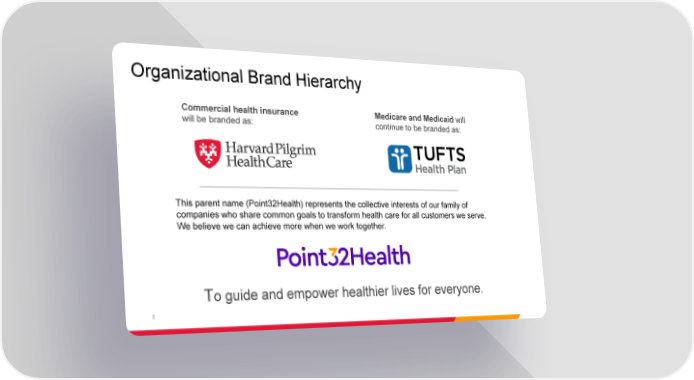 Organizational Brand Hierarchy Commercial health insurance Medicare and Medicaid will will be branded as: continue to be branded as: This parent name (Point32Health) represents the collective interests of our family of companies who share common goals to transform health care for all customers we serve. We believe we can achieve more when we work together. Toguide and empower healthier lives for everyone. 2