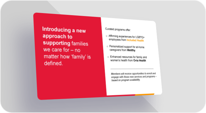 Introducing a new Curated programs offer: approach to o Affirming experiences for LGBTQ+ employees from Included Health supporting families o Personalized support for at-home we care for – no caregivers from Wellthy matter how ‘family’ is o Enhanced resources for family and defined. women’s health from Ovia Health Members will receive opportunities to enroll and engage with these new services and programs – based on program availability. 41 Confidential. Please do not distribute. General Business