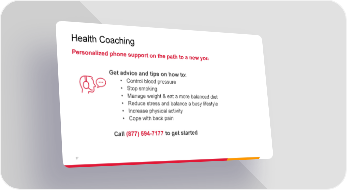 Health Coaching Personalized phone support on the path to a new you Health Coaching Get advice and tips on how to: • Control blood pressure • Stop smoking • Manage weight & eat a more balanced diet • Reduce stress and balance a busy lifestyle • Increase physical activity • Cope with back pain Call (877) 594-7177 to get started 27