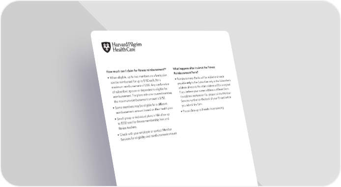 How much can I claim for 昀椀tness reimbursement?* What happens after I submit the Fitness • When eligible, up to two members on a family plan Reimbursement Form? can be reimbursed for up to $150 each, for a • Reimbursement checks will be mailed and made maximum reimbursement of $300. Any combination payable only to the Subscriber only at the Subscriber’s of subscriber, spouse or dependent is eligible for address of record. No other address will be accepted. reimbursement. For plans with one covered member, If you believe your current address is different from the maximum reimbursement amount is $150. the address we have on 昀椀le, please call the Member • Some members may be eligible for a different Services number on the back of your ID card before reimbursement amount based on their health plan. you submit the form. • Small group or individual plans in MA allow up • Please allow up to 8 weeks for processing. to $150 total for 昀椀tness membership fees and 昀椀tness trackers. • Check with your employer or contact Member Services for eligibility and reimbursement amount. * Fitness reimbursement may be considered taxable income. For tax information, consult your employer or tax advisor. Page 2 of 3