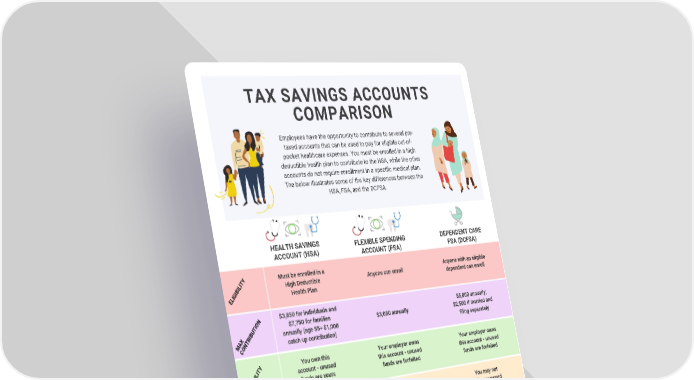A comparison of the Health Savings Account, Flexible Spending Account (no rollover), and the Dependent Care Account.