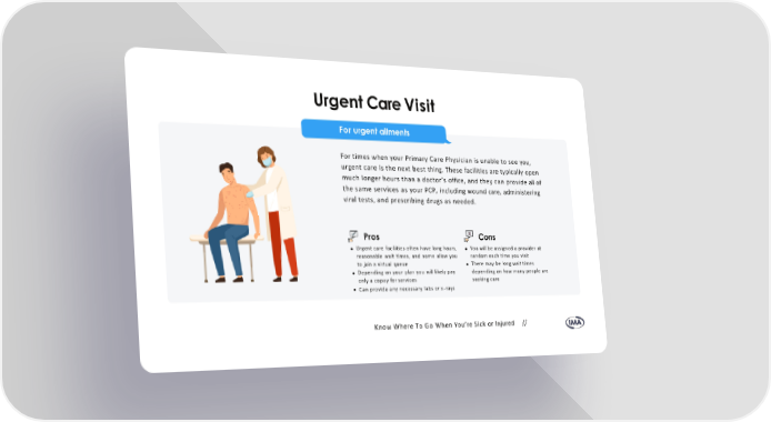 For times when your Primary Care Physician is unable to see you, urgent care is the next best thing. These facilities are typically open much longer hours than a doctor’s office, and they can provide all of the same services as your PCP, including wound care, administering viral tests, and prescribing drugs as needed. Urgent Care Visit For urgent ailments Pros Urgent care facilities often have long hours, reasonable wait times, and some allow you to join a virtual queue Depending on your plan you will likely pay only a copay for services Can provide any necessary labs or x-rays Cons You will be assigned a provider at random each time you visit There may be long wait times depending on how many people are seeking care Know Where To Go When You’re Sick or Injured //