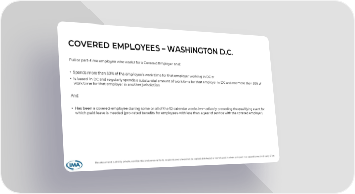 COVERED EMPLOYEES – WASHINGTON D.C. Full or part-time employee who works for a Covered Employer and: • Spends more than 50% of the employee’s work time for that employer working in DC or • Is based in DC and regularly spends a substantial amount of work time for that employer in DC and not more than 50% of work time for that employer in another jurisdiction And: • Has been a covered employee during some or all of the 52 calendar weeks immediately preceding the qualifying event for which paid leave is needed (pro-rated benefits for employees with less than a year of service with the covered employer) This document is strictly private, confidential and personal to its recipients and should not be copied, distributed or reproduced in whole or in part, nor passed to any third party // 28