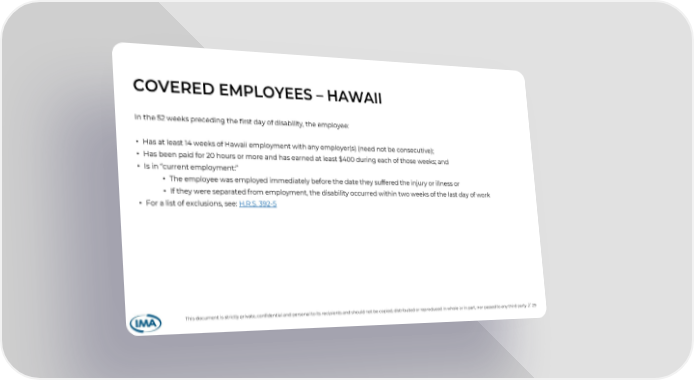 COVERED EMPLOYEES – HAWAII In the 52 weeks preceding the first day of disability, the employee: • Has at least 14 weeks of Hawaii employment with any employer(s) (need not be consecutive); • Has been paid for 20 hours or more and has earned at least $400 during each of those weeks; and • Is in “current employment:” • The employee was employed immediately before the date they suffered the injury or illness or • If they were separated from employment, the disability occurred within two weeks of the last day of work • For a list of exclusions, see: H.R.S. 392-5 This document is strictly private, confidential and personal to its recipients and should not be copied, distributed or reproduced in whole or in part, nor passed to any third party // 29