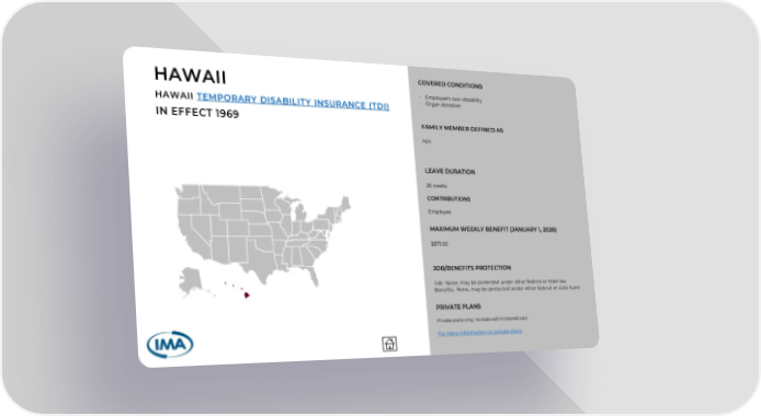COVERED CONDITIONS - Employee’s own disability - Organ donation FAMILY MEMBER DEFINED AS N/A LEAVE DURATION 26 weeks CONTRIBUTIONS Employee MAXIMUM WEEKLY BENEFIT (JANUARY 1, 2026) $871.00 JOB/BENEFITS PROTECTION Job: None, may be protected under other federal or state law Benefits: None, may be protected under other federal or state leave PRIVATE PLANS Private plans only; no state administered plan For More Information on private plans IN EFFECT 1969 HAWAII TEMPORARY DISABILITY INSURANCE (TDI) HAWAII