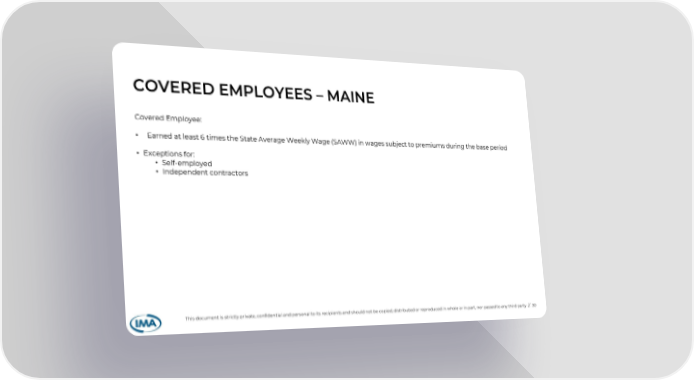 COVERED EMPLOYEES – MAINE Covered Employee: • Earned at least 6 times the State Average Weekly Wage (SAWW) in wages subject to premiums during the base period • Exceptions for: • Self-employed • Independent contractors This document is strictly private, confidential and personal to its recipients and should not be copied, distributed or reproduced in whole or in part, nor passed to any third party // 30
