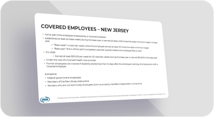 COVERED EMPLOYEES – NEW JERSEY • Full or part-time employee employed by a Covered Employer • Established at least 20 base weeks during the base year or earned at least 1,000 times the state minimum wage in a base year • “Base week”: a calendar week where the employee earned at least 20 times the state minimum wage • “Base year”: first 4 of the last 5 completed calendar quarters before the employee files a claim • For 2026: • Earned at least $310.00 per week for 20 calendar weeks during the base year or earned $15,500 in the base year • Under the care of a licensed health care provider • Former employees are covered if disability started less than 14 days after the employee’s last day of employment with a Covered Employer Exclusions: • Federal government employees • Members of the New Jersey state police • Workers who are not technically employees (such as properly classified independent contractors) This document is strictly private, confidential and personal to its recipients and should not be copied, distributed or reproduced in whole or in part, nor passed to any third party // 35