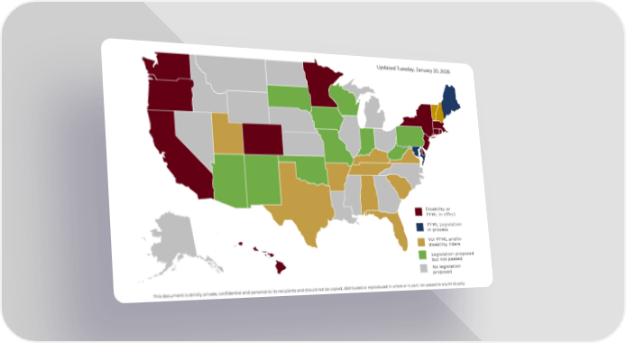 Disability or PFML in effect PFML Legislation in process Vol PFML and/or disability riders No legislation proposed This document is strictly private, confidential and personal to its recipients and should not be copied, distributed or reproduced in whole or in part, nor passed to any third party. Updated Tuesday, January 20, 2026 Legislation proposed but not passed