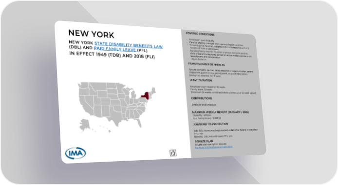 COVERED CONDITIONS - Employee’s own disability - Care for a family member with a serious health condition - To bond with a newborn, adopted child, or foster child within 12 months of birth or placement - Assisting family member(s) when a spouse, domestic partner, child or parent is deployed abroad on active military service or on leave for rest and recuperation - Organ donation FAMILY MEMBER DEFINED AS Spouse, domestic partner, child, stepchild or legal custodian, parent, stepparent, parent-in-law, grandparent, or grandchild, sibling (biological, adopted, half & step) LEAVE DURATION Employee’s own disability: 26 weeks Family leave: 12 weeks [Maximum 26 weeks combined within a consecutive 52-week period] COBTRIBUTIONS Employer and Employee MAXIMUM WEEKLY BENEFIT (JANUARY 1, 2026) Disability - $170.00 Paid Family Leave - $1,228.53 JOB/BENEFITS PROTECTION Job: DBL: None, may be protected under other federal or state law; PFL: Yes Benefits: DBL: not addressed; PFL: yes PRIVATE PLAN Private plan exemption allowed For More Information on private plans IN EFFECT 1949 (TDB) AND 2018 (FLI) NEW YORK STATE DISABILITY BENEFITS LAW (DBL) AND PAID FAMILY LEAVE (PFL) NEW YORK