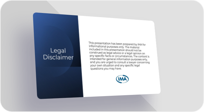 Legal Disclaimer This presentation has been prepared by IMA for informational purposes only. The material included in this presentation should not be construed as legal advice or a legal opinion on any specific facts or circumstances. The content is intended for general information purposes only, and you are urged to consult a lawyer concerning your own situation and any specific legal questions you may have.