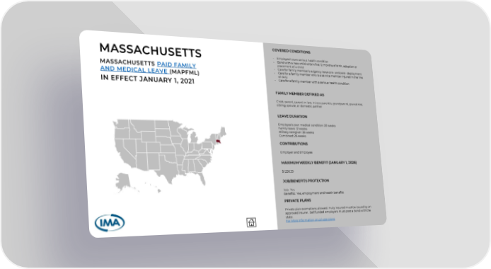 COVERED CONDITIONS - Employee’s own serious health condition - Bond with a new child within first 12 months of birth, adoption or placement of a child - Care for family member’s exigency leave pre- and post- deployment - Care for a family member who is a service member injured in the line of duty - Care for a family member with a serious health condition FAMILY MEMBER DEFINED AS Child, parent, parent-in-law, in loco parentis, grandparent, grandchild, sibling, spouse, or domestic partner LEAVE DURATION Employee’s own medical condition: 20 weeks Family leave: 12 weeks Military caregiver: 26 weeks Combined: 26 weeks CONTRIBUTIONS Employer and Employee MAXIMUM WEEKLY BENEFIT (JANUARY 1, 2026) $1,230.39 JOB/BENEFITS PROTECTION Job: Yes Benefits: Yes, employment and health benefits PRIVATE PLANS Private plan exemptions allowed. Fully insured must be issued by an approved insurer. Self funded employers must post a bond with the state. For More Information on private plans IN EFFECT JANUARY 1, 2021 MASSACHUSETTS PAID FAMILY AND MEDICAL LEAVE (MAPFML) MASSACHUSETTS