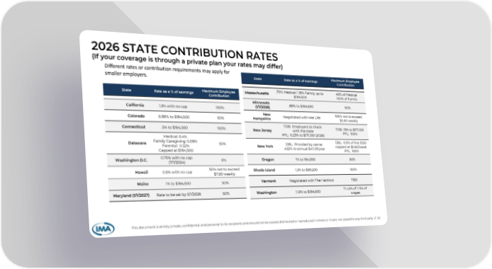 2026 STATE CONTRIBUTION RATES (If your coverage is through a private plan your rates may differ) State Rate as a % of earnings Maximum Employee Contribution Massachusetts .70% Medical / .18% Family up to $184,500 40% of Medical 100% of Family Minnesota (1/1/2026) .88% to $184,500 50% New Hampshire Negotiated with Met Life 100% not to exceed $5.00 weekly New Jersey TDB: Employers to check with the state PFL: 0.23% to $171,100 (2026) TDB: .19% to $171,100 PFL: 100% New York DBL: Provided by carrier .432% to annual $411.91/year DBL: 0.5% of first $120 capped at $0.60/week PFL: 100% Oregon 1% to 184,500 60% Rhode Island 1.3% to $89,200 100% Vermont Negotiated with The Hartford TBD Washington 1.13% to $184,500 71.43% of 1.13% of wages State Rate as a % of earnings Maximum Employee Contribution California 1.3% with no cap 100% Colorado 0.88% to $184,500 50% Connecticut .5% to $184,500 100% Delaware Medical: 0.4% Family Caregiving: 0.08% Parental: 0.32% Capped at $184,500 50% Washington D.C. 0.75% with no cap (7/1/2024) 0% Hawaii 0.5% with no cap 50% not to exceed $7.50 weekly Maine 1% to $184,500 50% Maryland (1/1/2027) Rate to be set by 5/1/2026 50% This document is strictly private, confidential and personal to its recipients and should not be copied, distributed or reproduced in whole or in part, nor passed to any third party // 20 Different rates or contribution requirements may apply for smaller employers.