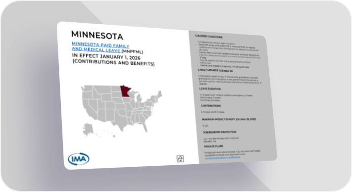 COVERED CONDITIONS - Employee’s own serious health condition - Bond with a new child within first 12 months of birth (or hospital confinement if longer than birthing parent), adoption or placement of a child - Care for family member’s exigency leave pre- and post- deployment - Care for a family member who is a service member injured in the line of duty - Care for a family member with a serious health condition - Safety leave - Medical care related to pregnancy, including pre-natal FAMILY MEMBER DEFINED AS Child, parent, parent-in-law, in loco parentis, grandparent, spouse’s grandparent, son or daughter-in-law, grandchild, sibling, spouse, or domestic partner, individual whose relationship creates expectation of reliance LEAVE DURATION Employee’s own medical condition and exigency: 12 weeks Family leave: 12 weeks Combined: 20 weeks CONTRIBUTIONS Employer and Employee MAXIMUM WEEKLY BENEFIT (October 26, 2025) $1,423 JOB/BENEFITS PROTECTION Job: Yes, after 90 days of employment Benefits: Yes PRIVATE PLANS Private plan exemptions allowed. Fully insured or self funded issued/administered by an approved insurer. For More Information on private plans IN EFFECT JANUARY 1, 2026 (CONTRIBUTIONS AND BENEFITS) MINNESOTA PAID FAMILY AND MEDICAL LEAVE (MNPFML) MINNESOTA