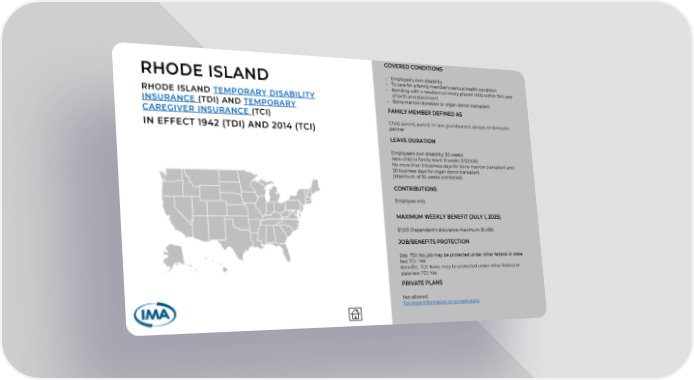 COVERED CONDITIONS - Employee’s own disability - To care for a family member’s serious health condition - Bonding with a newborn or newly placed child within first year of birth and placement - Bone marrow donation or organ donor transplant FAMILY MEMBER DEFINED AS Child, parent, parent-in-law, grandparent, spouse, or domestic partner LEAVE DURATION Employee’s own disability: 30 weeks New child or family leave: 8 weeks (1/1/2026) No more than 5 business days for bone marrow transplant and 30 business days for organ donor transplant [Maximum of 30 weeks combined] CONTRIBUTIONS Employee only MAXIMUM WEEKLY BENEFIT (JULY 1, 2025) $1,103 (Dependent’s allowance maximum $1,489) JOB/BENEFITS PROTECTION Job: TDI: No, job may be protected under other federal or state law; TCI: Yes Benefits: TDI: None, may be protected under other federal or state law; TCI: Yes PRIVATE PLANS Not allowed. For More Information on private plans IN EFFECT 1942 (TDI) AND 2014 (TCI) RHODE ISLAND TEMPORARY DISABILITY INSURANCE (TDI) AND TEMPORARY CAREGIVER INSURANCE (TCI) RHODE ISLAND