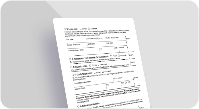 B. Living trust - Primary Contingent If this form is executed by the insured, it is understood and agreed that if MetLife receives satisfactory proof that the aforesaid trust has been revoked or is not in effect at the insured's death, the beneficiary shall be the insured's Estate, unless otherwise indicated on this form. Trust name Trust date (mm/dd/yyyy) Trustee phone number Share % Trustee - First name Middle initial Last name Trustee address - Street City State ZIP code C. Testamentary trust created in the insured's will - Primary Contingent Share % The trust(ee) under any last Will and Testament of mine as shall be admitted to probate. D. Insured's estate - Primary Contingent Share % If the Insured's Estate is selected as the Primary Beneficiary, no Contingent Beneficiary may be named. E. Charity/Organization - Primary Contingent Be sure to name the charity or organization and not the charity or organization director or an employee of that charity/organization. Charity/Organization name Phone number Share % Address - Street City State ZIP code Accidental Death & Dismemberment for Supplemental/Optional life - Beneficiary designation I elect that the beneficiary designation indicated below applies to the Accidental Death & Dismemberment plans insured by MetLife: A. Individual beneficiaries Primary beneficiary - Your first choice to receive your life insurance proceeds in the event of your death. If any primary beneficiaries predecease you, that person's share will be equally divided among any remaining primary beneficiaries. First name Middle initial Last name Share % Address - Street City State ZIP code Relationship to employee Social security number Date of birth (mm/dd/yyyy) Phone number Page 6 of 8 GR-TR-BENE-EMP-M (12/18) Fs/f