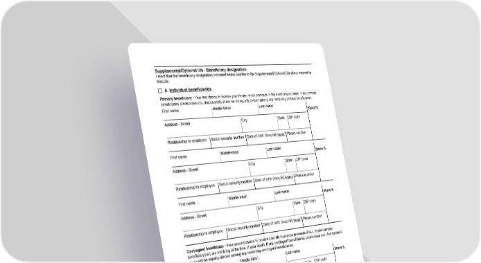 Supplemental/Optional life - Beneficiary designation I elect that the beneficiary designation indicated below applies to the Supplemental/Optional Life plans insured by MetLife: A. Individual beneficiaries Primary beneficiary - Your first choice to receive your life insurance proceeds in the event of your death. If any primary beneficiaries predecease you, that person's share will be equally divided among any remaining primary beneficiaries. First name Middle initial Last name Share % Address - Street City State ZIP code Relationship to employee Social security number Date of birth (mm/dd/yyyy) Phone number First name Middle initial Last name Share % Address - Street City State ZIP code Relationship to employee Social security number Date of birth (mm/dd/yyyy) Phone number First name Middle initial Last name Share % Address - Street City State ZIP code Relationship to employee Social security number Date of birth (mm/dd/yyyy) Phone number Contingent beneficiary - Your second choice to receive your life insurance proceeds if ALL of your primary beneficiary(ies) are not living at the time of your death. If any contingent beneficiaries predecease you, that person’s share will be equally divided among any remaining contingent beneficiaries. First name Middle initial Last name Share % Address - Street City State ZIP code Relationship to employee Social security number Date of birth (mm/dd/yyyy) Phone number First name Middle initial Last name Share % Address - Street City State ZIP code Relationship to employee Social security number Date of birth (mm/dd/yyyy) Phone number Page 5 of 8 GR-TR-BENE-EMP-M (12/18) Fs/f