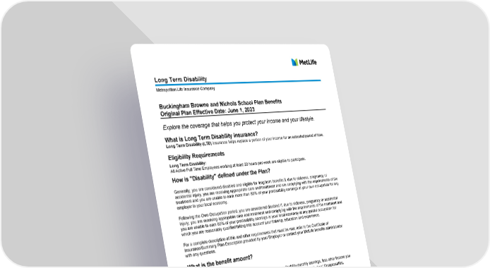 Long Term Disability Metropolitan Life Insurance Company Buckingham Browne and Nichols School Plan Benefits Original Plan Effective Date: June 1, 2023 Explore the coverage that helps you protect your income and your lifestyle. What is Long Term Disability insurance? Long Term Disability (LTD) insurance helps replace a portion of your income for an extended period of time. Eligibility Requirements Long Term Disability: All Active Full Time Employees working at least 20 hours per week are eligible to participate. How is "Disability" defined under the Plan? Generally, you are considered disabled and eligible for long term benefits if, due to sickness, pregnancy or accidental injury, you are receiving appropriate care and treatment and are complying with the requirements of the treatment and you are unable to earn more than 80% of your predisability earnings at your own occupation for any employer in your local economy. Following the Own Occupation period, you are considered disabled if, due to sickness, pregnancy or accidental injury, you are receiving appropriate care and treatment and complying with the requirements of the treatment and you are unable to earn 60% of your predisability earnings in your local economy at any gainful occupation for which you are reasonably qualified taking into account your training, education and experience. For a complete description of this and other requirements that must be met, refer to the Certificate of Insurance/Summary Plan Description provided by your Employer or contact your MetLife benefits administrator with any questions. What is the benefit amount? Long Term Disability: The Long Term Disability benefit replaces a portion of your predisability monthly earnings, less other income you may receive from other sources1 during the same Disability (e.g., Social Security, Workers’ Compensation, vacation pay etc.). The Benefit amount is 60% of your predisability monthly earnings. What is the maximum monthly benefit? The amount of Long Term Disability benefit may not exceed the maximum monthly benefit established under the plan, regardless of your annual salary amount. The maximum under this plan is $6,500. When do benefits begin and how long do they continue? Long Term Disability: Benefits begin after the end of the elimination period. The elimination period begins on the day you become disabled and is the length of time you must wait while being disabled before you are eligible to receive a benefit. Your elimination period for Long Term Disability is 90 days. 200 Park Ave., New York, NY 10166 © 2022 MetLife Services and Solutions, LLC DI-GCERT-STDLTD LTD GCERT Benefit Summary L1222028130[exp0624][xCA]