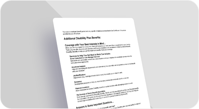 Your plan’s maximum benefit period and any specific limitations are described in the Certificate of Insurance provided by your Employer. Additional Disability Plan Benefits: Coverage with Your Best Interests in Mind… When you are ill or injured for a long time, MetLife® believes you need more than a supplement to your income. That’s why we offer return-to-work services and financial incentives and assistance in obtaining Social Security Disability Benefits to help you get the maximum benefits from your coverage. Services to Help You Get Back to Work Can Include: Nurse Consultant or Case Manager Services: Specialists who personally contact you, your physician and your employer to coordinate an early return-to- work plan when appropriate. Vocational Analysis: Help with identifying job requirements and determining how your skills can be applied to a new or modified job with your employer. Job Modifications: Adjustments (e.g., redesign of work station tools) that enable you to return to work. Retraining: Development programs to help you return to your previous job or educate you for a new one. Financial Incentives: Allow employees to receive Disability benefits or partial benefits while attempting to return to work. The Services of Social Security Specialists: Once you are approved for Disability benefits, Metlife can help you obtain Social Security Disability benefits. Our specialists can guide you through the initial application and appeals processes and may also help you access legal assistance from attorneys or vendors to pursue Social Security benefits. Answers to Some Important Questions… Q. Can I still receive benefits if I return to work part time? A. Yes. As long as you are disabled and meet the terms of your Disability plan, you may qualify for adjusted disability benefits. Your plan offers financial and Rehabilitation incentives designed to help you to return to work when appropriate, even on a part-time basis when you participate in an approved Rehabilitation Program. While disabled, you may receive up to 100% of your predisability earnings when combining benefits, Rehabilitation Incentives and other income sources such as Social Security Disability Benefits and state disability benefits, and part-time earnings. With the Rehabilitation Incentive you can get a 10% increase in your monthly benefit. The Family Care Incentive provides reimbursement up to $400 per month for eligible expenses, such as child care during the first 24 months of disability. You may be eligible for the Moving Expense Incentive if you incur expenses in order to move to a new residence recommended as part of the Rehabilitation Program. Expenses must be approved in advance. 200 Park Ave., New York, NY 10166 © 2022 MetLife Services and Solutions, LLC DI-GCERT-STDLTD LTD GCERT Benefit Summary L1222028130[exp0624][xCA]