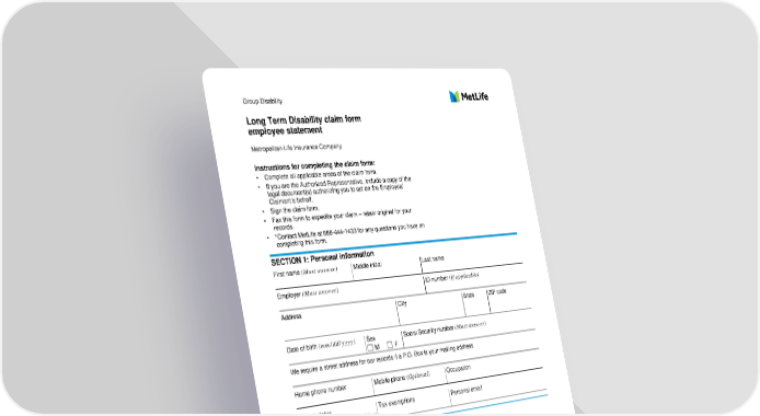 Group Disability Long Term Disability claim form employee statement Metropolitan Life Insurance Company Instructions for completing the claim form: • Complete all applicable areas of the claim form. • If you are the Authorized Representative, include a copy of the legal document(s) authorizing you to act on the Employee/ Claimant’s behalf. • Sign the claim form. • Fax this form to expedite your claim – retain original for your records. • *Contact MetLife at 888-444-1433 for any questions you have on completing this form. SECTION 1: Personal information First name (Must answer) Middle initial Last name Employer (Must answer) ID number (If applicable) Address City State ZIP code Date of birth (mm/dd/yyyy) Sex Social Security number (Must answer) M F We require a street address for our records if a P.O. Box is your mailing address Home phone number Mobile phone (Optional) Occupation Marital status Tax exemptions Personal email Married Single Other Dependent information Spouse First name Middle name Last name Date of birth (mm/dd/yyyy) Social Security number Children First name Middle name Last name Date of birth (mm/dd/yyyy) Social Security number Page 1 of 9 EES-LTD-5323 (08/20) Fs/f