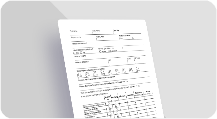 First name Last name Specialty Phone number Fax number Dates of treatment From To Reason for treatment Have you been hospitalized? If Yes, give dates from to Yes No Inpatient Outpatient Name of hospital Address of hospital City State ZIP code Cross highest education level completed. 1 2 3 4 5 6 7 8 9 10 11 12 13 14 15 16 17 18 Degrees, certificates, license/skills or training obtained Please describe what prevents you from performing the duties of your job. Have you applied for or are you receiving income from any other sources? Yes No If yes, provide the following information. Applied Receiving $ Amount Frequency From date To date for (mm/dd/yyyy) (mm/dd/yyyy) Salary continuance/Sick leave Short term disability Worker’s compensation State disability Social Security Dependent Social Security No fault (Income replacement) Retirement/Pension Permanent total disability Other (Please identify) Page 3 of 9 EES-LTD-5323 (08/20) Fs/f
