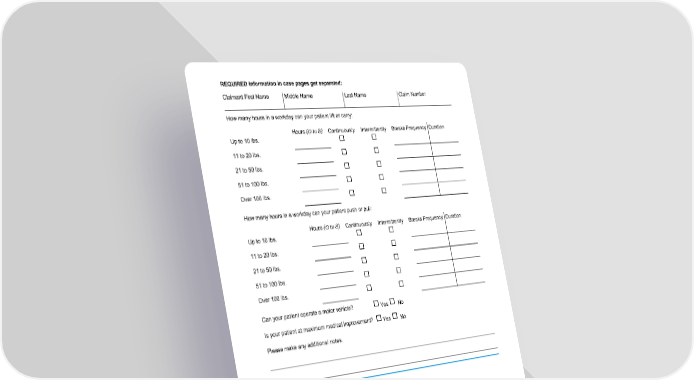 REQUIRED information in case pages get separated: Claimant First Name Middle Name Last Name Claim Number How many hours in a workday can your patient lift or carry: Hours (0 to 8) Continuously Intermittently Breaks Frequency Duration Up to 10 lbs. 11 to 20 lbs. 21 to 50 lbs. 51 to 100 lbs. Over 100 lbs. How many hours in a workday can your patient push or pull: Hours (0 to 8) Continuously Intermittently Breaks Frequency Duration Up to 10 lbs. 11 to 20 lbs. 21 to 50 lbs. 51 to 100 lbs. Over 100 lbs. Can your patient operate a motor vehicle? Yes No Is your patient at maximum medical improvement? Yes No Please make any additional notes. About Your Patient's Prognosis Have you advised your patient when they can return to work? Yes (Check all that apply) To regular occupation. On date (mm/dd/yyyy) Full-time Part-time Modified duty To any other occupation. On date (mm/dd/yyyy) Full-time Part-time Modified duty No (Please explain) List any restrictions to work or activity. (Please be as specific as possible.) APS-STDLTD-5320 (06/20) Page 4 of 7