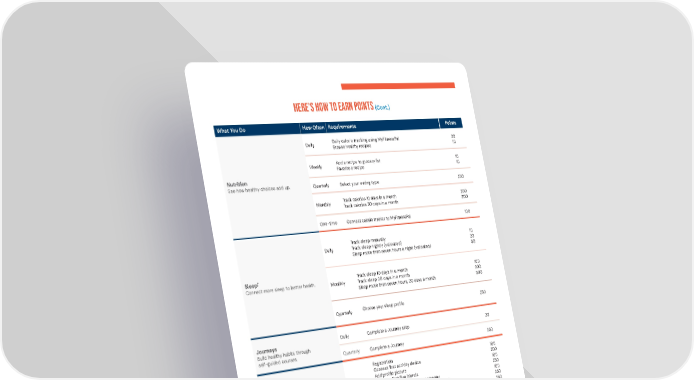 Here’s How to Earn Points (Cont.) What You Do How Often Requirements Points Daily Daily calorie tracking using MyFitnessPal 20 Browse healthy recipes 10 Weekly Add a recipe to grocery list 10 Favorite a recipe 10 Nutrition See how healthy choices add up. Quarterly Select your eating type 250 Monthly Track calories 10 days in a month 200 Track calories 20 days in a month 300 One-time Connect calorie tracker to MyFitnessPal 100 Track sleep manually 10 Daily Track sleep nightly (validated) 20 Sleep more than seven hours a night (validated) 50 † Sleep Track sleep 10 days in a month 100 Connect more sleep to better health. Monthly Track sleep 20 days in a month 200 Sleep more than seven hours, 20 days a month 300 Quarterly Choose your sleep profile 250 Journeys Daily Complete a Journey step 20 Build healthy habits through self-guided courses. Quarterly Complete a Journey 250 Registration 100 Connect first activity device 200 More Ways to Earn Add profile picture 100 Do the little things. One-time Add your first five friends 250 Add a friend outside of your company 100 Invite up to five colleagues (50 points each) 250 Initial sign-in on your mobile app 250 † Validated sleep data is required to earn points. Questions? Chat live at member.virginpulse.com, email [email protected], or call (toll-free) 1-844-854-7285. Blue Cross Blue Shield of Massachusetts complies with applicable federal civil rights laws and does not discriminate on the basis of race, color, national origin, age, disability, sex, sexual orientation, or gender identity. ATTENTION: If you don’t speak English, language assistance services, free of charge, are available to you. Call Member Service at the number on your ID card (TTY: 711). ATENCIÓN: Si habla español, tiene a su disposición servicios gratuitos de asistencia con el idioma. Llame al número de Servicio al Cliente que figura en su tarjeta de identificación (TTY: 711). ATENÇÃO: Se fala português, são-lhe disponibilizados gratuitamente serviços de assistência de idiomas. Telefone para os Serviços aos Membros, através do número no seu cartão ID (TTY: 711). ® Registered Marks of the Blue Cross and Blue Shield Association. ®´ Registered Marks, TM Trademarks, and SM Service Marks are the property of their respective owners. 001301880 (1/22) © 2022 Blue Cross and Blue Shield of Massachusetts, Inc., or Blue Cross and Blue Shield of Massachusetts HMO Blue, Inc.