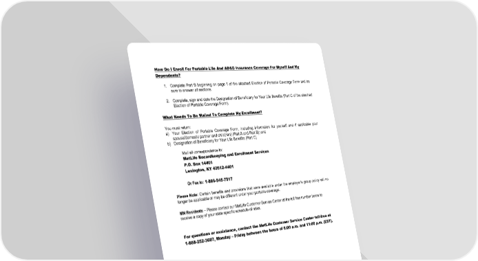 How Do I Enroll For Portable Life And AD&D Insurance Coverage For Myself And My Dependents? 1. Complete Part B beginning on page 1 of the attached Election of Portable Coverage Form and be sure to answer all sections. 2. Complete, sign and date the Designation of Beneficiary for Your Life Benefits (Part C of the attached Election of Portable Coverage Form). What Needs To Be Mailed To Complete My Enrollment? You must return: a) Your Election of Portable Coverage Form, including information for yourself and if applicable your spouse/domestic partner and child(ren) (Part A and Part B); and b) Designation of Beneficiary for Your Life Benefits (Part C) Mail all correspondence to: MetLife Recordkeeping and Enrollment Services P.O. Box 14401 Lexington, KY 40512-4401 Or Fax to: 1-866-545-7517 Please Note: Certain benefits and provisions that were available under the employer’s group policy will no longer be applicable or may be different under your portable coverage. MN Residents – Please contact our MetLife Customer Service Center at the toll free number below to receive a copy of your state specific schedule of rates. For questions or assistance, contact the MetLife Customer Service Center toll-free at 1-888-252-3607, Monday – Friday between the hours of 8:00 a.m. and 11:00 p.m. (EST). EPORT NW INSTRUCTIONS EPORT (07/19)