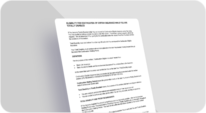 ELIGIBILITY FOR CONTINUATION OF CERTAIN INSURANCE WHILE YOU ARE TOTALLY DISABLED GCERT2000 47 cp/all If You become Totally Disabled while You are insured for Continuation Eligible Insurance under this policy, You may qualify to continue certain insurance under this section. If continued, premium payment will not be required. We will determine if You qualify for this continuation after We receive Proof that You have satisfied the conditions of this section. Total Disability must start before You attain age 60 and while You are insured for Continuation Eligible Insurance. Your Total Disability must continue without interruption from the date You became Totally Disabled through the end of the Continuation Waiting Period. DEFINITIONS For the purpose of this section, “Continuation Eligible Insurance” means Your · Basic Life Insurance; · Basic Accidental Death and Dismemberment Insurance if You continue Basic Life Insurance; to the extent that such insurance was in effect for You on the date Your Total Disability began. Continuation Eligible Insurance does not include Life Insurance amounts accelerated under the section entitled LIFE INSURANCE: ACCELERATED BENEFIT OPTION FOR YOU. Continuation Waiting Period means the period which starts on the date You become Totally Disabled and ends 9 consecutive months later. Total Disability or Totally Disabled means, for purposes of this section, that due to an injury or sickness: · You are unable to perform the material and substantial duties of Your regular job; and · You are unable to perform any other job for which You are fit by education, training or experience. TOTAL DISABILITY AND PROOF REQUIREMENTS If You become disabled You should contact Us as soon as reasonably possible. After the Continuation Waiting Period ends, You must send Us Proof that You were Totally Disabled with no interruption throughout the Continuation Waiting Period. You must do this within the time frame specified in the section entitled FILING A CLAIM. As part of such Proof, We may choose a Physician to examine You to verify that You are Totally Disabled. We will pay for the exam. After We receive and review Your Proof, We will determine if You qualify. We will notify You in writing of Our decision. To verify that You continue to be Totally Disabled without interruption, We may require from time to time that You send Us Proof that You continue to be Totally Disabled. We will not ask for Proof more than once each year. IF YOU DIE OR SUSTAIN A LOSS COVERED BY THE CONTINUED INSURANCE DURING CONTINUATION If You die or sustain a loss for which you believe benefits may be payable during the continuation, Proof of the death must be sent to Us. In addition to the Proof which is otherwise required for the insurance, the Proof must show that Your Total Disability continued with no interruption from the date We informed You that the continuation was approved until the date of the death or the date of loss. When We receive such Proof with the claim, We will review the claim and if We approve it, will pay any benefit payable under the insurance continued under this section.