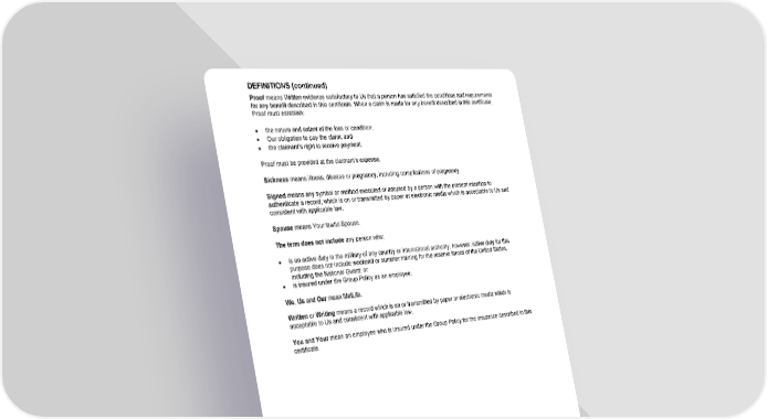 DEFINITIONS (continued) GCERT2000 30 def Proof means Written evidence satisfactory to Us that a person has satisfied the conditions and requirements for any benefit described in this certificate. When a claim is made for any benefit described in this certificate, Proof must establish: · the nature and extent of the loss or condition; · Our obligation to pay the claim; and · the claimant’s right to receive payment. Proof must be provided at the claimant’s expense. Sickness means illness, disease or pregnancy, including complications of pregnancy. Signed means any symbol or method executed or adopted by a person with the present intention to authenticate a record, which is on or transmitted by paper or electronic media which is acceptable to Us and consistent with applicable law. Spouse means Your lawful Spouse. The term does not include any person who: ● is on active duty in the military of any country or international authority; however, active duty for this purpose does not include weekend or summer training for the reserve forces of the United States, including the National Guard; or ● is insured under the Group Policy as an employee. We , Us and Our mean MetLife. Written or Writing means a record which is on or transmitted by paper or electronic media which is acceptable to Us and consistent with applicable law. You and Your mean an employee who is insured under the Group Policy for the insurance described in this certificate.