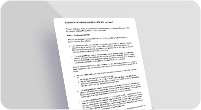 ELIGIBILITY PROVISIONS: INSURANCE FOR YOU (continued) GCERT2000 32 e/ee If You are not Actively at Work on the date the Noncontributory Insurance benefit would otherwise take effect, the insurance will take effect on the day You resume Active Work. Rules for Contributory Insurance If You request Contributory Insurance before the date You become eligible for such insurance, such insurance will take effect as follows: ● if You are not required to give evidence of Your insurability, such insurance will take effect on the date You become eligible, provided You are Actively at Work on that date. Basic Accidental Death and Dismemberment Insurance does not require evidence of Your insurability but such insurance will not take effect until the day Your Basic Life Insurance takes effect. ● if You are required to give evidence of Your insurability and We determine that You are insurable, such insurance will take effect on the date We state in Writing, provided You are Actively at Work on that date. Basic Accidental Death and Dismemberment Insurance does not require evidence of Your insurability but such insurance will not take effect until the day Your Basic Life Insurance takes effect. If You request Contributory Insurance within 12 months of the date You become eligible for such insurance, or during the Employer’s next annual enrollment period, whichever occurs first , such insurance will take effect as follows: ● if You are not required to give evidence of Your insurability, such insurance will take effect on the later of: ● the date You become eligible for such insurance; and ● the date You enroll provided You are Actively at Work on that date. Basic Accidental Death and Dismemberment Insurance does not require evidence of Your insurability but such insurance will not take effect until the day Your Basic Life Insurance takes effect. ● if You are required to give evidence of Your insurability and We determine that You are insurable, such insurance will take effect on the date We state in Writing, provided You are Actively at Work on that date. Basic Accidental Death and Dismemberment Insurance does not require evidence of Your insurability but such insurance will not take effect until the day Your Basic Life Insurance takes effect. ● If You request Contributory Insurance more than 12 months after the date You become eligible for such insurance or after the first annual enrollment period for which You may enroll, whichever occurs first , You must give such evidence at Your expense. If We determine that You are insurable, such insurance will take effect on the date We state in Writing, if You are Actively at Work on that date. Basic Accidental Death and Dismemberment Insurance does not require evidence of Your insurability but such insurance will not take effect until the day Your Basic Life Insurance takes effect. If You are not Actively at Work on the date insurance would otherwise take effect, insurance will take effect on the day You resume Active Work. See the DEFINITIONS section of this certificate for a complete list of Contributory Insurance benefits. Increase in Insurance An increase in insurance due to a change in class of employee, an increase in Your earnings, or a requested increase in insurance will take effect as follows: ● if You are required to give evidence of insurability for the entire increase and We approve Your evidence of insurability, the increase will take effect on the date We state in Writing. If We do not approve Your evidence of insurability, or You do not submit evidence of insurability, the increase in insurance will not take effect. ● if You are required to give evidence of insurability for a portion of the increase: ● the portion of the increase that is not subject to evidence of insurability will take effect on the date of Your request or the date of the increase in Your earnings. Basic Accidental Death and