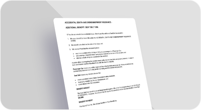 ACCIDENTAL DEATH AND DISMEMBERMENT INSURANCE - ADDITIONAL BENEFIT: SEAT BELT USE GCERT2000 52 add/seatbelt If You die as a result of an accidental injury, We will pay this additional Seat Belt Use benefit if: 1. We pay a benefit for loss of life under the ACCIDENTAL DEATH AND DISMEMBERMENT INSURANCE section; 2. this benefit is in effect on the date of the injury; and 3. We receive Proof that the deceased person: · was in an accident while driving or riding as a passenger in a Passenger Car; · was wearing a Seat Belt which was properly fastened at the time of the accident; and · died as a result of injuries sustained in the accident. A police officer investigating the accident must certify that the Seat Belt was properly fastened. A copy of such certification must be submitted to Us with the claim for benefits. Passenger Car means any validly registered four-wheel private passenger car. It does not include any commercially licensed car or any private car being used for commercial purposes. Seat Belt means any restraint device that: · meets published United States Government safety standards; · is properly installed by the car manufacturer; and · is not altered after the installation. BENEFIT AMOUNT The Seat Belt Use benefit is an additional benefit equal to 10% of the Full Amount shown in the SCHEDULE OF BENEFITS . However, the amount We will pay for this benefit will not be less than $1,000 or more than $25,000 . BENEFIT PAYMENT For loss of Your life, We will pay benefits to Your Beneficiary.