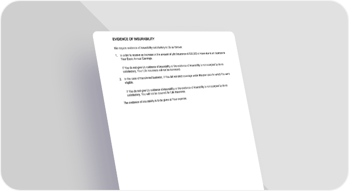 EVIDENCE OF INSURABILITY GCERT2000 41 eoi We require evidence of insurability satisfactory to Us as follows: 1. In order to receive an increase in the amount of Life Insurance of $50,000 or more due to an increase in Your Basic Annual Earnings. If You do not give Us evidence of insurability or the evidence of insurability is not accepted by Us as satisfactory, Your Life Insurance will not be increased. 2 . In the case of transferred business, if You did not elect coverage under the prior plan for which You were eligible. If You do not give Us evidence of insurability or the evidence of insurability is not accepted by Us as satisfactory, You will not be covered for Life Insurance. The evidence of insurability is to be given at Your expense.